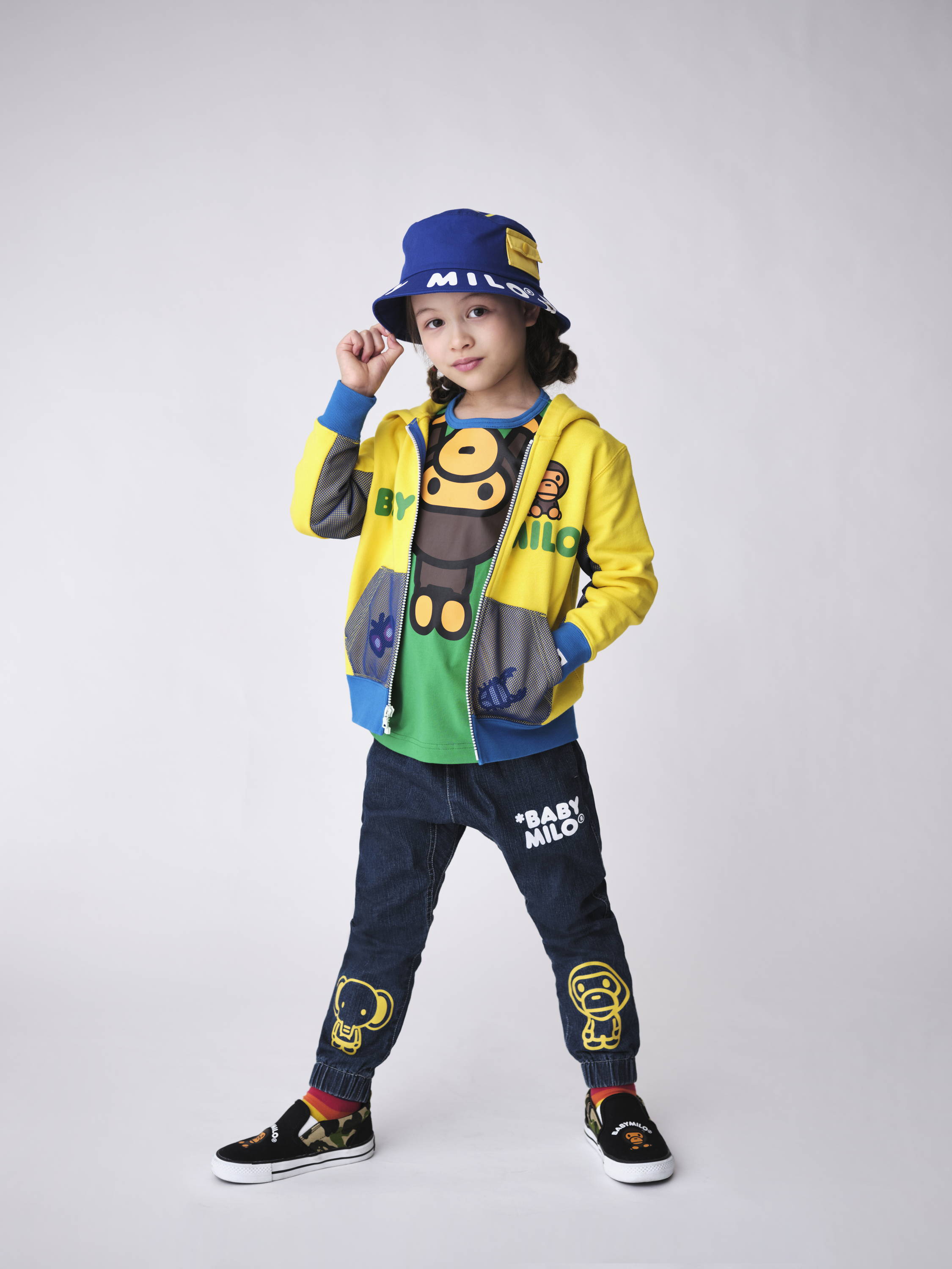 The main focus of the collection is on designs inspired by American culture, such as patchworking and preserving T-shirts worn during school days. The MILO character and bright colors add to the pop feel. In addition, many items are made with kid-sized sagara fabric and felt patches, giving them a cute feel.